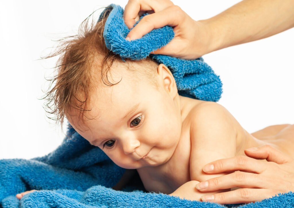 Drying Techniques: To prevent tangling and breaking, it’s critical to gently dry your baby’s hair and scalp after bath time. Use a soft towel to gently pat the hair and scalp dry rather than rubbing it in a rough manner. Rubbing too much might cause friction and possibly harm the fragile hair follicles. You can speed up the drying process if your kid has longer hair or if you just prefer it. Just use a hair dryer on the low heat setting. To avoid overheating and pain on the scalp, keep your distance from your baby’s head at least six inches.